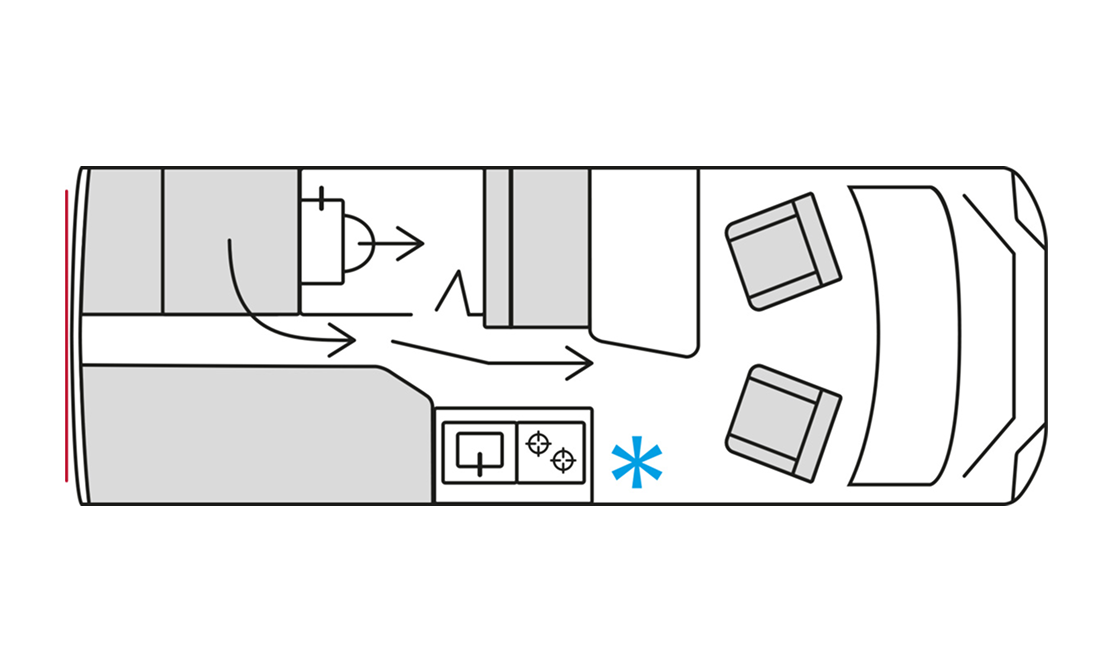 Interiøret har en innendørs dusj, et kjemisk Porta Potti-toalett og materialer av høy kvalitet for et komfortabelt liv på farten. Kjøkkenet er utstyrt med gasskomfyr og plass til en liten gassflaske. Til tross for den lette vekten har denne modellen de viktigste bekvemmelighetene du trenger for en behagelig og uavhengig reise.